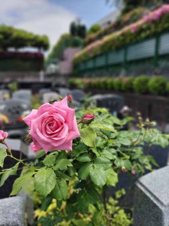 霊園全体に、さまざまな種類の植栽がまんべんなく配置されており、四季折々の姿を魅せてくれます。園内のバラは春から秋にかけて、他にも春は、桜やツツジ、藤の花、モッコウバラ、秋には、辺りの山々が色づく姿を楽しむことができるそうです。
