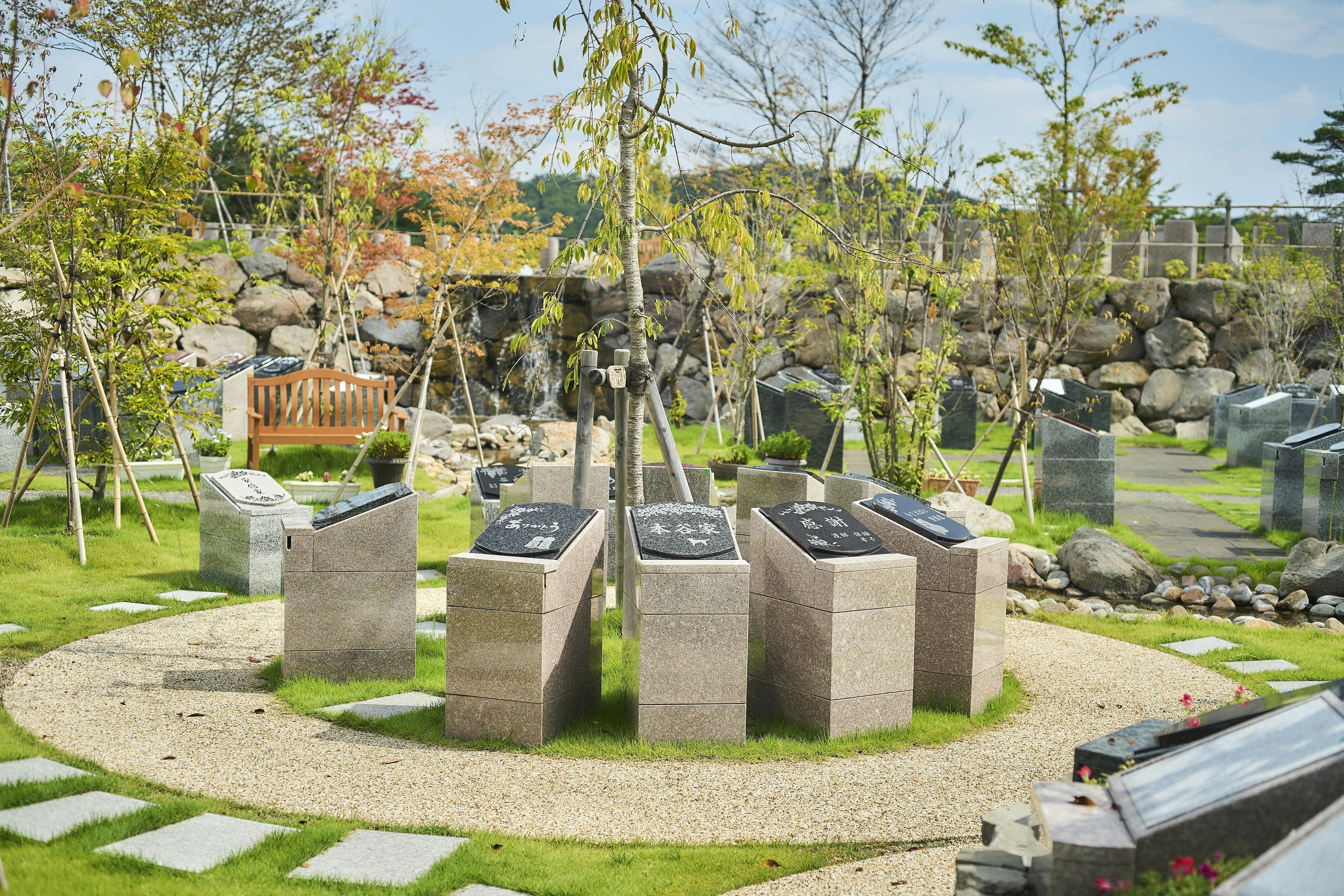 園内には滝、休憩用の東屋も完備。季節の花々や木々の緑を愛でながら、ご家族でゆっくりと故人を偲ぶことができます。